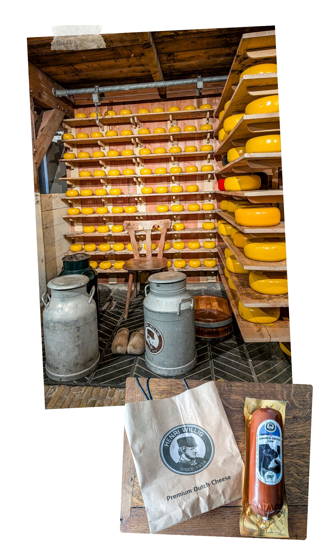 Pendant notre balade, on s’est arrêtés à la Ferme de Catharina Hoeve, où l’on peut découvrir la fabrication du fromage, mais aussi goûter différents fromages et même en acheter ! Après avoir goûté plusieurs fromages, on a jeté notre dévolu sur un fromage fumé. On en a eu pour 13,95€, ce n’est pas donné mais c’est une vraie tuerie ! Et en plus c’est un beau bébé !